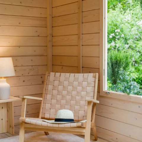 A garden log cabin is the perfect place for relaxing and rewinding while listening to birds singing and wind humming in the trees around you. Large windows ensure you’re always in touch with the surrounding nature. The cabin also serves as a comfortable extra room that can accommodate guests in the summer. Make it welcoming with cosy blankets and cushions adding to the soft overall feel.