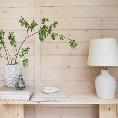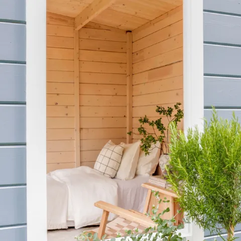 This garden log cabin was painted with Tikkurila exterior colour Q451, an easy yet lively blue with a hint of grey, on the outside with opaque wooden facade paint Vinha. White window frames in Tiira accentuate the light and serene style. The combination of these exterior colours with natural wood, subtle detailing and simple interior design creates a calming effect. Warm lighting, carefully selected houseplants, and other details complement the serenity of the colour scheme.