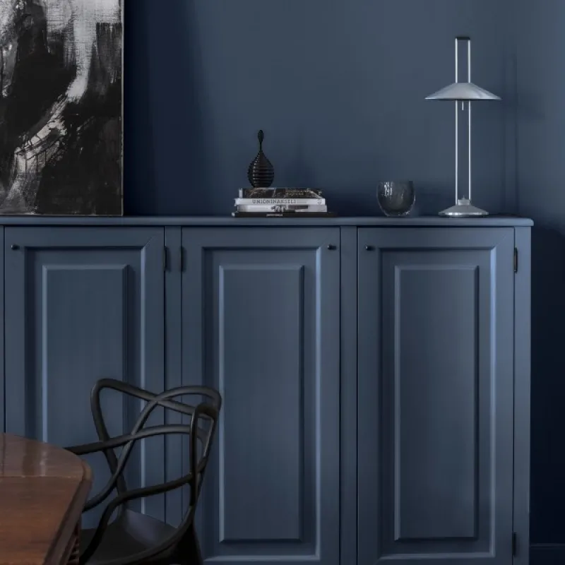 Atlantis reflects the deep blue of the ocean and the mystery of a sunken island. This calming dark blue, located in the middle of the blue palette, helps to create a hazy atmosphere in the room.