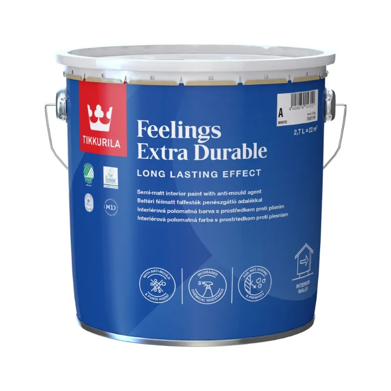 Semi-matt, low-odour Feelings Extra Durable has exceptional chemical resistance. The painted surface can withstand the strongest detergents and hard wear in demanding environments.