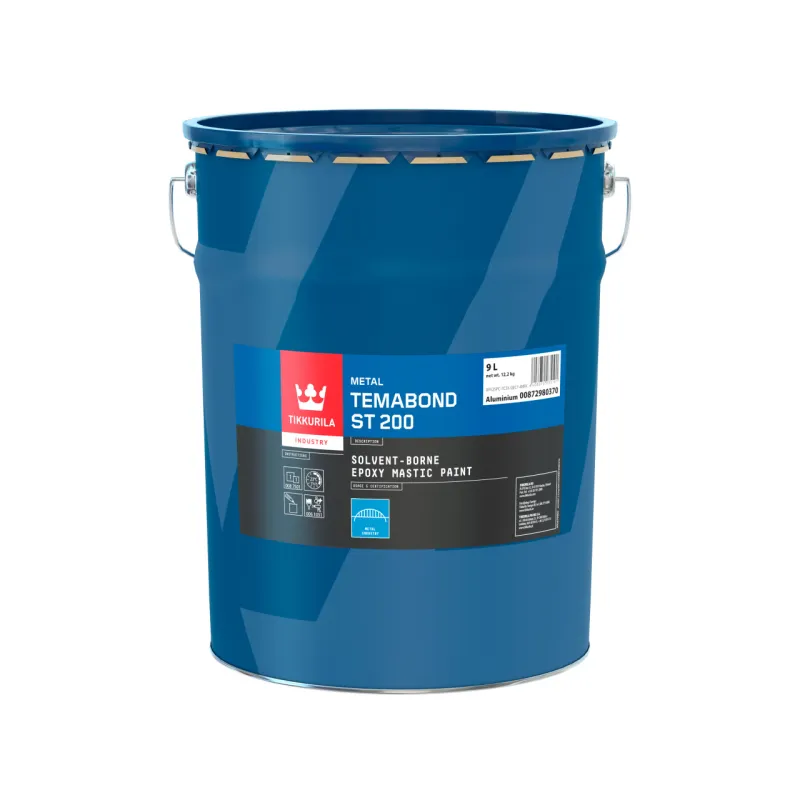 • An ideal solution for maintenance painting due to its very good adhesion even to hand-prepared steel. As a high-solids product, the paint has lower VOC emissions than conventional epoxy paints. • Withstands immersion in water and can therefore be used e.g. on steel structures immersed in water or buried in soil. • Due to its aluminium pigmentation, Temabond ST 200 forms a very tight film with good chemical and abrasion resistance. The paint is used in systems for repainting and touch-up painting steel surfaces that are difficult to clean, such as bridges, cisterns and different types of steelwork and equipment in the wood-processing and chemical industries. • High film build properties, also by brush. • Can also be applied on old alkyd paint surfaces. • Can be used as a single coat paint. • Winter grade version Temabond WG 200 can be cured at lower temperatures.