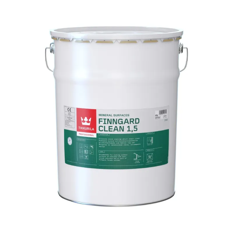 Finngard Clean 1,5 -julkisivupinnoite is a facade coating for concrete structures, block, and mineral-based building board surfaces. The tintable plaster provides a dirt- and water-repellent facade that stays clean even in impure weather conditions. Finngard Clean 1,5 -julkisivupinnoite repels dirt from polluted air, preventing it from settling on the facade. Due to its superhydrophobic surface, this plaster repels dirt and water superbly well, keeping buildings clean and dry.