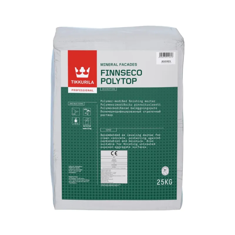 Polymer-modified cement mortar that slows down the penetration of moisture and carbon dioxide into the underlying concrete. Finnseco Polytop, gray: SILKO-approved (3.231). Grain size 0–0.6 mm.