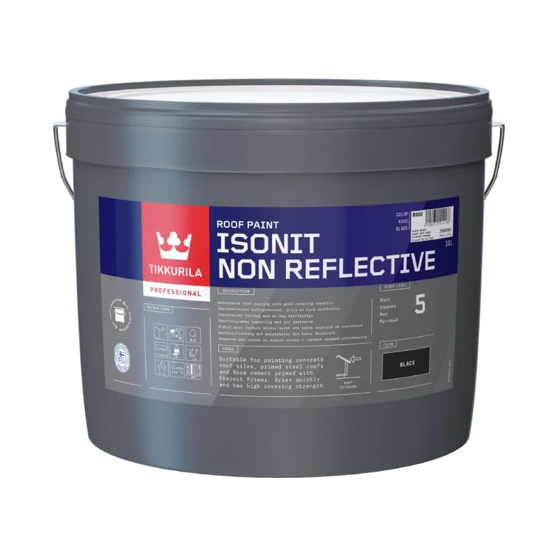Isonit Non Reflective is a waterborne roof coating especially suitable for cratered roofs of fibre cement. The special paint spreads the reflection of the sunlight resulting in the surface looking more evenly matt instead of appearing faded and pale. Isonit Non Reflective has high coverage and a short drying time. The coating creates a water repellent surface that is diffusion-open, allowing water vapour coming from inside the material to pass through. Good flow and levelling properties. Strong and water-repellent surface. Light-fast and weather-stable.